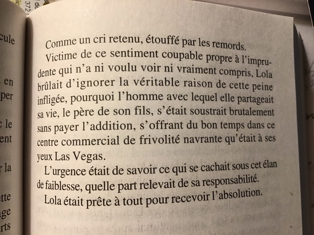 J’avais envie de me claquer la tête au mur (et j’ai une migraine constante depuis trois jours) tellement ce thriller est alourdi de phrases pleines d’effets de style qui font artificiel. C’est le contraire d’une lecture fluide. J’ai dû relire plein de phrases une deuxième fois pour les comprendre. Ce serait risible si ce n’était pas triste. Livre de 600 pages qui aurait été super en soustrayant (mot très utilisé dans le bouquin) toutes les lourdeurs. 350 pages et c’était top. Pour le mot soustraire je cite « Ses cheveux blond cendré s’étaient soustraits au coup de brosse matinal » … vous voyez le genre ? Et à un moment Lola a une migraine. : « Sa migraine se déployait telle une carte routière » »Des éclairs traversaient les brumes intérieures de son âme jusqu’à l’aveuglement »…. 😳